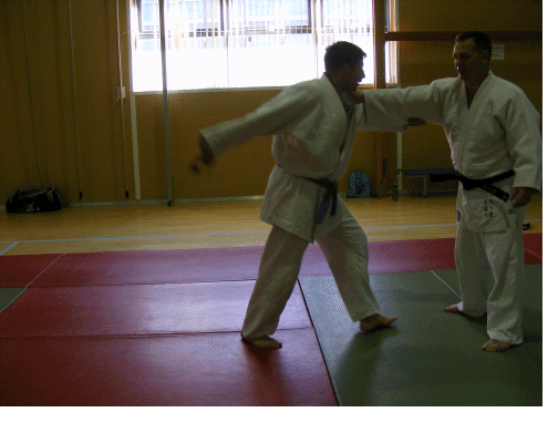 foot outside uke's left foot unbalancing uke to the rear, and with a